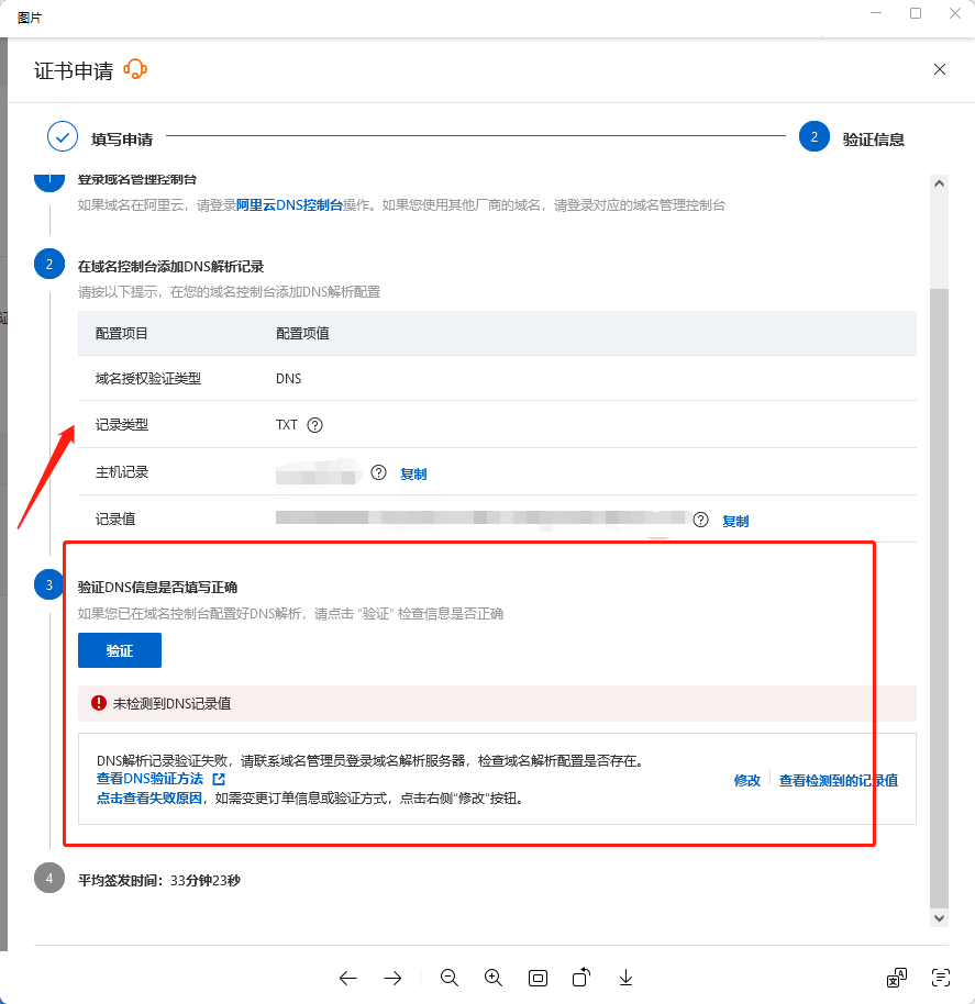 验证之后如果出现失败的提示,是因为在腾讯云后台没有添加对应的解析记录,解析记录需要按照第二点去腾讯云对应的域名里面去解析一下记录值
